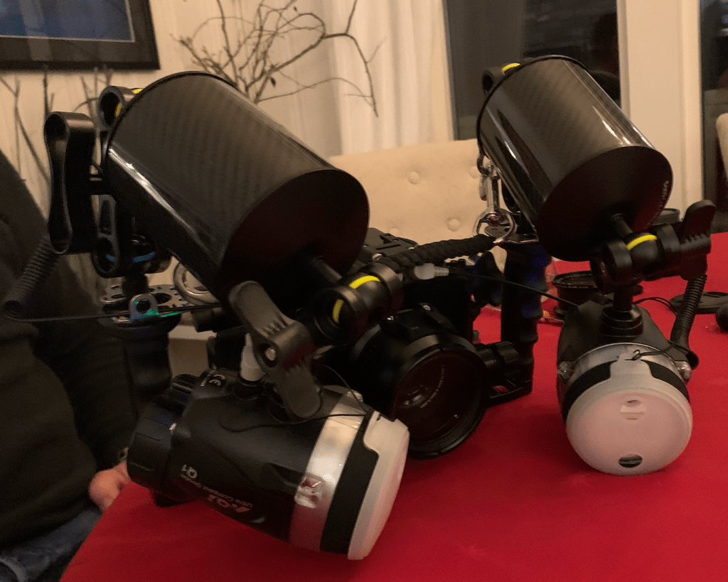 Jeg ble anbefalt et Sony A6600 med Nauticam undervannshus. En makroport 45, med Sony 16-50 mm linse og en AOI UCL-900 (+15), samt en vidvinkel port Nauticam 7 med en Sony 10-18 mm linse. Lysriggen ble to strober AOI Q1. Sjekk ut https://fotografit.eu for detaljer. Lars hjelper deg sikkert mer enn gjerne hvis du også er nysgjerrig på dette. Om du ikke forstod noe av det tekniske gjør det absolutt ingenting:-)