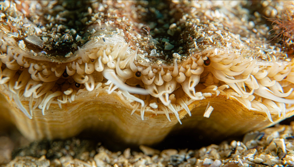 På bildet av kamskjellet ser du faktisk øynene. De sitter som perler på en snor rundt hele åpningen. Det har jeg aldri sett før. Ser du på bildet av den store fisken ser du kanskje også to andre skapninger. Havet er vakkert og spennende ikke sant?